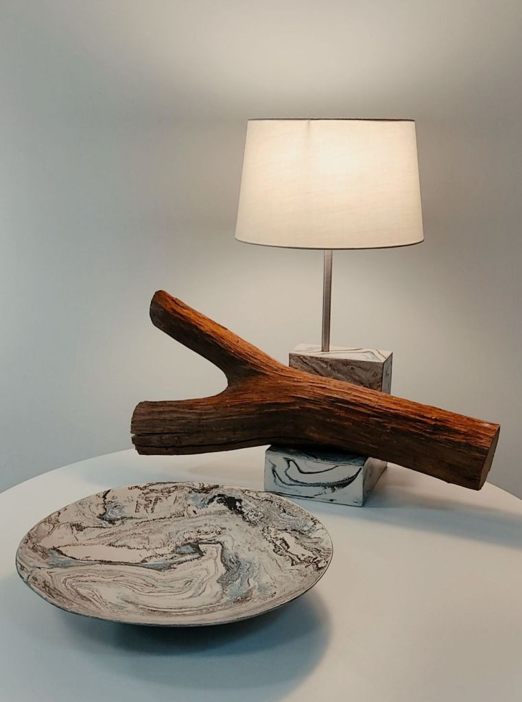 Lampe numéro 1, Esprit de mer Au premier plan Coupe Hommage faïence et bois naturel, métal brossé.