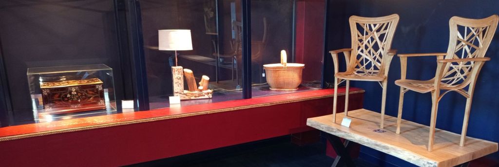 À gauche « cassette de Pierre Gole » restaurée par Julien Hébras lauréat de la catégorie « restauration » du concours régional des Ateliers d’art de France Centre Val de Loire 2025. https://www.facebook.com/share/p/15uF7q1pRP/ Au centre luminaire « Esprit de nature, luminaire n°3 » des Faïences de Milloux – Fabrice Béquet CréationsÀ droite, fauteuils du lauréat Arnaud Bourlier dans la catégorie « création ». https://www.facebook.com/share/p/19qK4s1zeq/