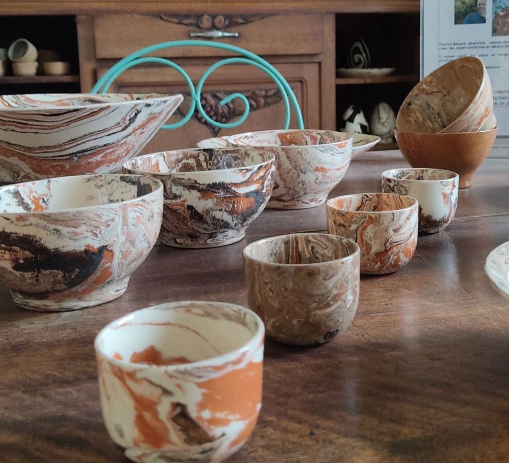 Chaque création selon la technique des terres mêlées (nériage) est le fruit d’un travail minutieux, de la préparation des mélanges d’argile de couleurs différentes jusqu’à la marque de l’objet apposée à la main dans le respect des techniques ancestrales.